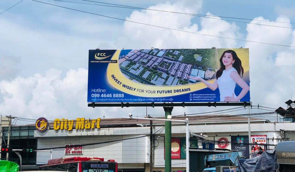 ကျိုက်ဝိုင်းဘုရားလမ်းနှင့် အင်းစိန်လမ်းထောင့်ရှိအချက်အချာကျသော နေရာတွင် FCC ၏ Billboard . . .